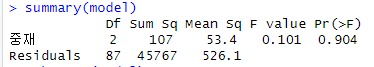 - summary() : 분산분석 모델의 분석 결과를 출력한다