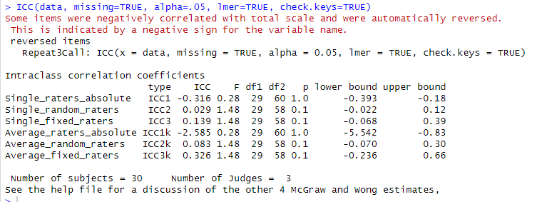 ICC(dataset, missing=TRUE, alpha=.05, lmer=TRUE, check.keys=TRUE)